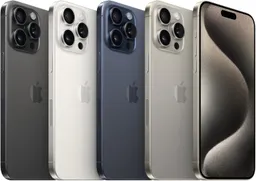 📷 تصویر: نمای کامل Apple iPhone 15 Pro Max با بدنه تیتانیومی در رنگ‌های مختلف – White Titanium، Black Titanium، Blue Titanium و Natural Titanium